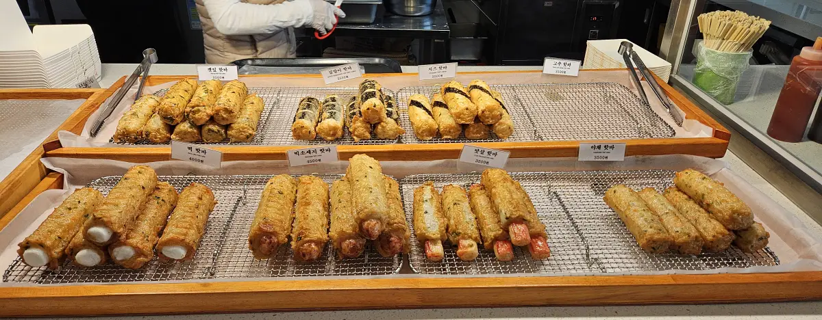 토스트, 호두과자, 핫바, 핫도그..정도가 다였던 것 같아요. 제가 갔을 땐 막 조리된 핫바가 디피되는 중이였어요.