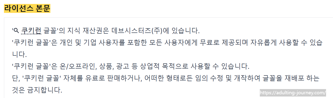 단, 아래와 같은 라이선스 본문을 꼭 확인하셔야 합니다. 개인 및 기업 사용자를 포함한 모든 사용자에게 무료로 제공된다는 문구를 확인하셔야해요. 일부 문구는 출처를 명시할 것을 조건으로 내걸기도 합니다.