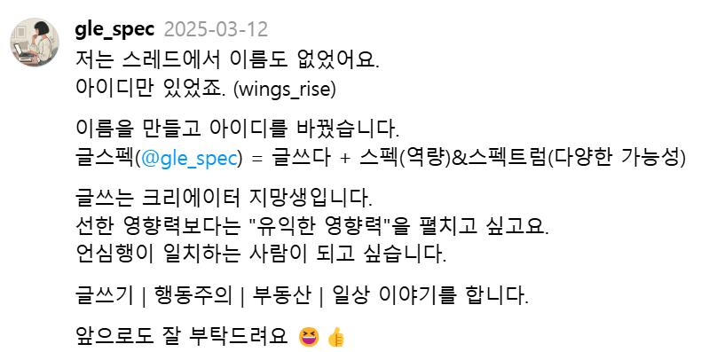 저는 스레드를 시작하고 3개월만에 닉네임이 생겼습니다. 그전까지는 브랜딩이 아예 없었어요.