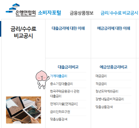 전국은행연합회 소비자포털의 "가계 대출금리 비교" 기능을 활용하면 전국 은행의 이자율을 대략적으로 검색할 수 있습니다.