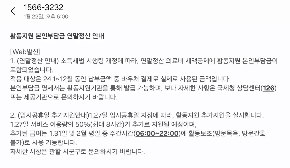 연말정산 시 활동지원 본인부담금이 의료비로 추가된다는 것은 이미 연락을 받아서 알고 있었는데요, 1월 27일 월요일 임시공휴일 추가지원 안내는 처음 받았습니다.